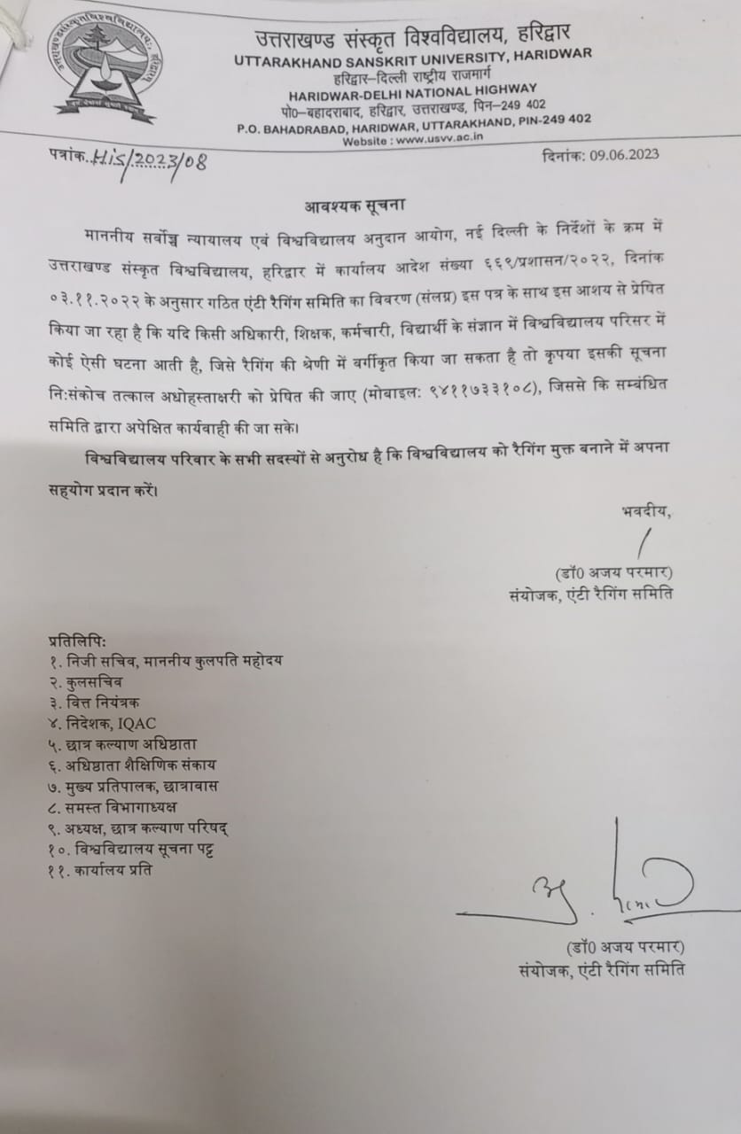 | डॉ. अजय परमार, सहायक आचार्य | संयोजक, एन्टी रैगिंग समिति | uhca2012@gmail.com | 9411733108 |