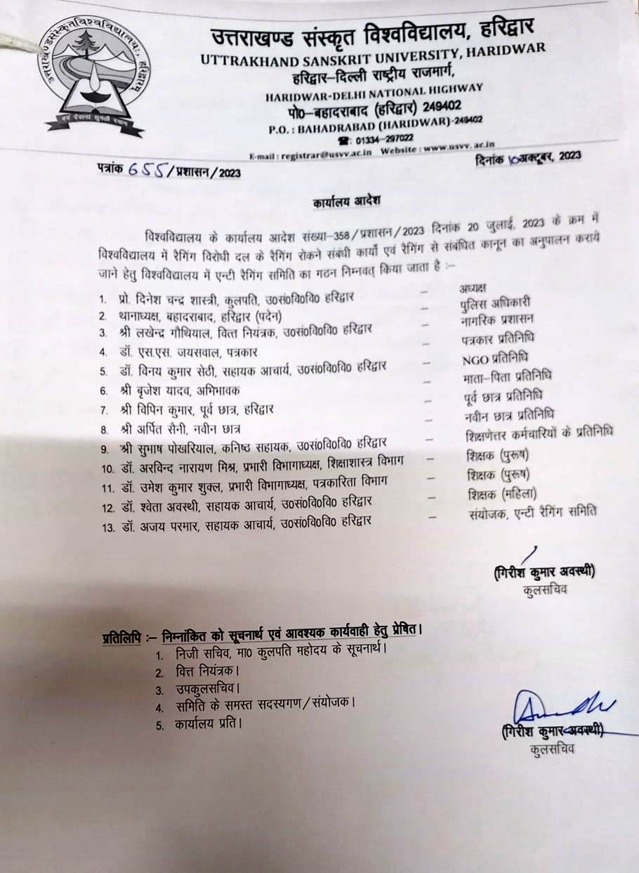 | प्रो. दिनेश चन्द्र शास्त्री , कुलपति | अध्यक्ष | vs@usvv.ac.in | 9410192541 |