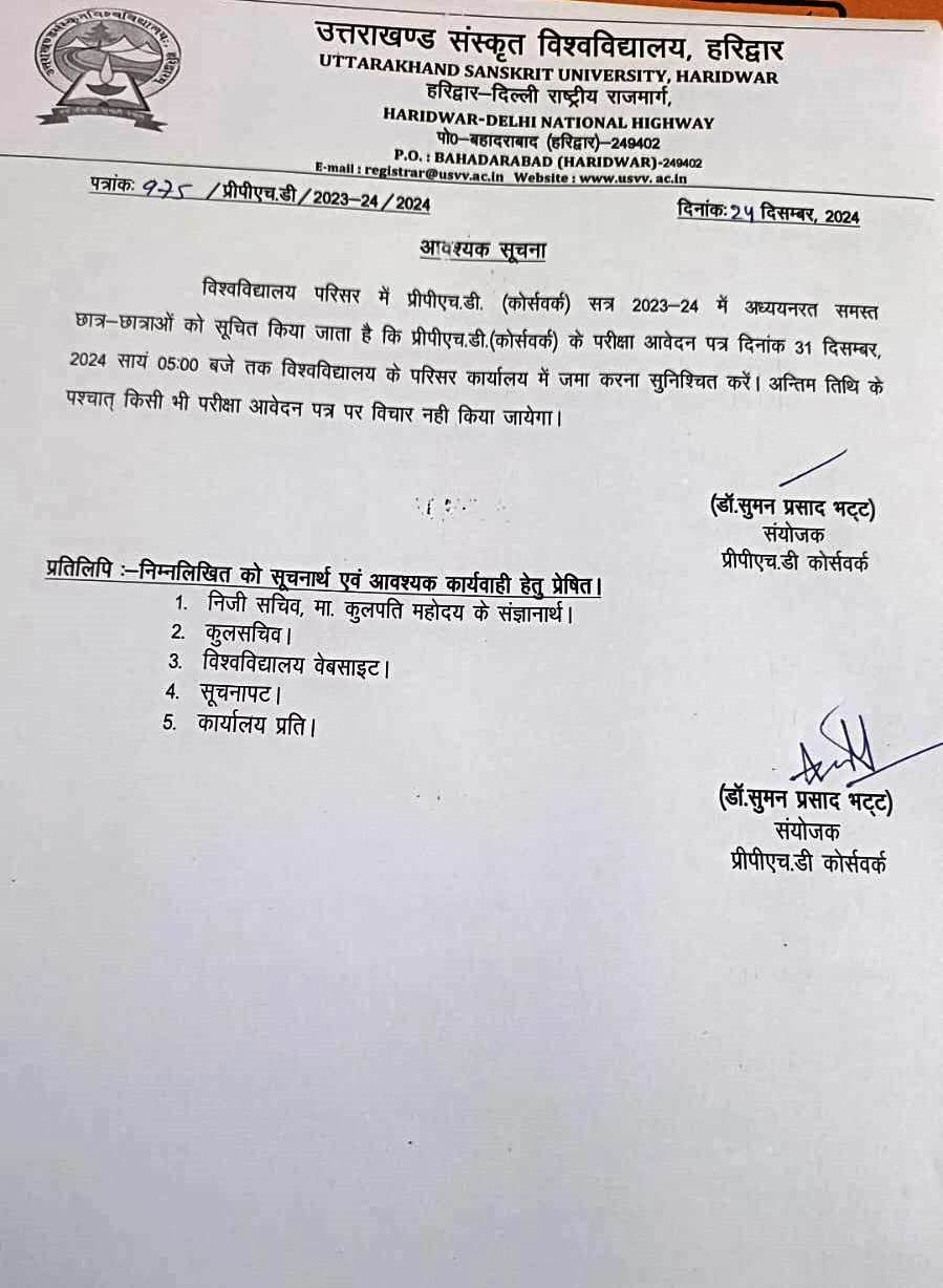 प्री-पीएच.डी. (कोर्सवर्क) के परीक्षा आवेदन पत्र के संबंध में आवश्यक सूचना