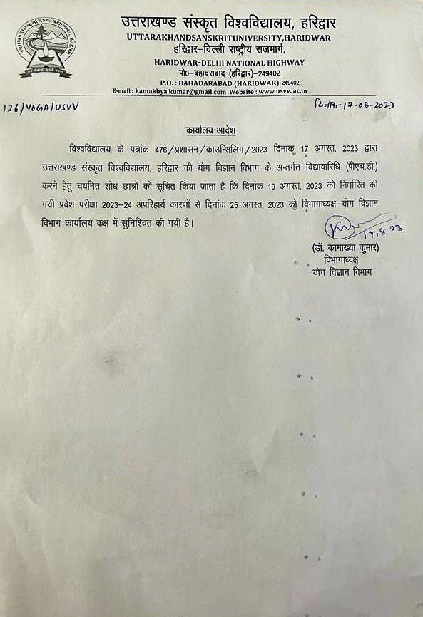 योग विज्ञान विभाग में पीएच. डी. प्रेवश परीक्षा 2023-24 हेतु काउन्सिलिंग एवं साक्षात्कार हेतु आवश्यक सूचना