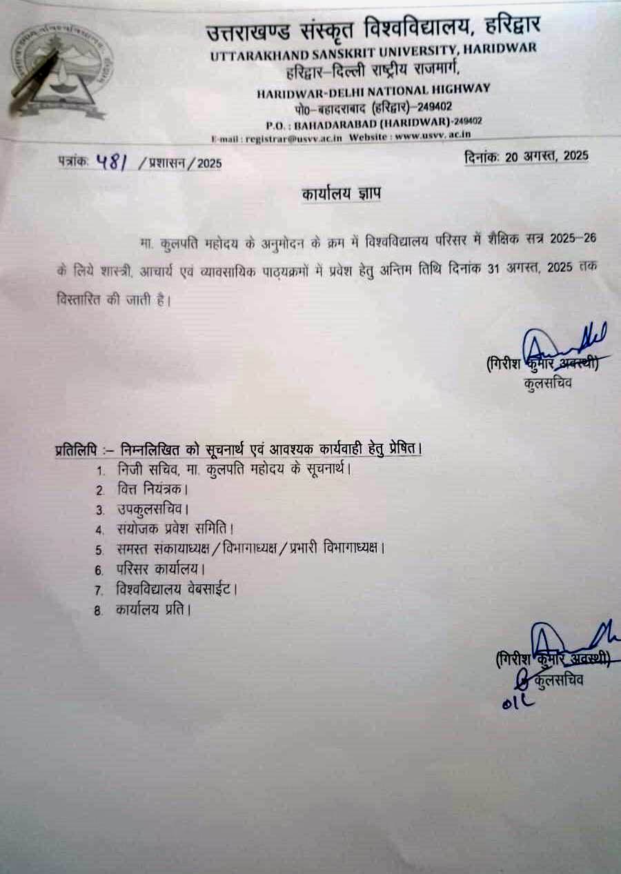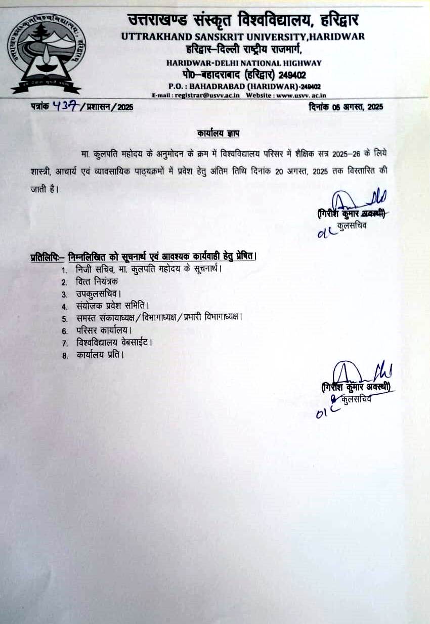 विश्वविद्यालय परिसर में शैक्षिक सत्र 2025-26 के लिए प्रवेश हेतु अंतिम तिथि विस्तारित किये जाने के संबंध में